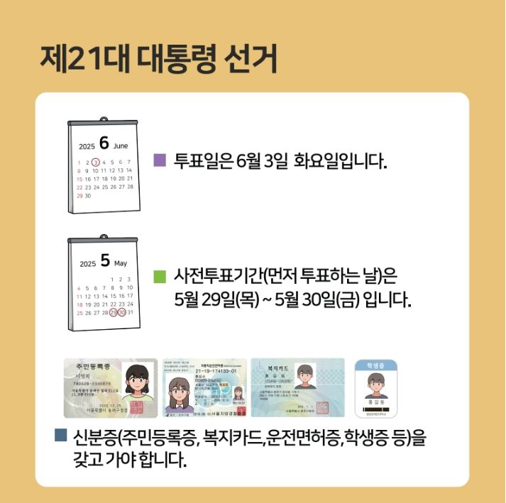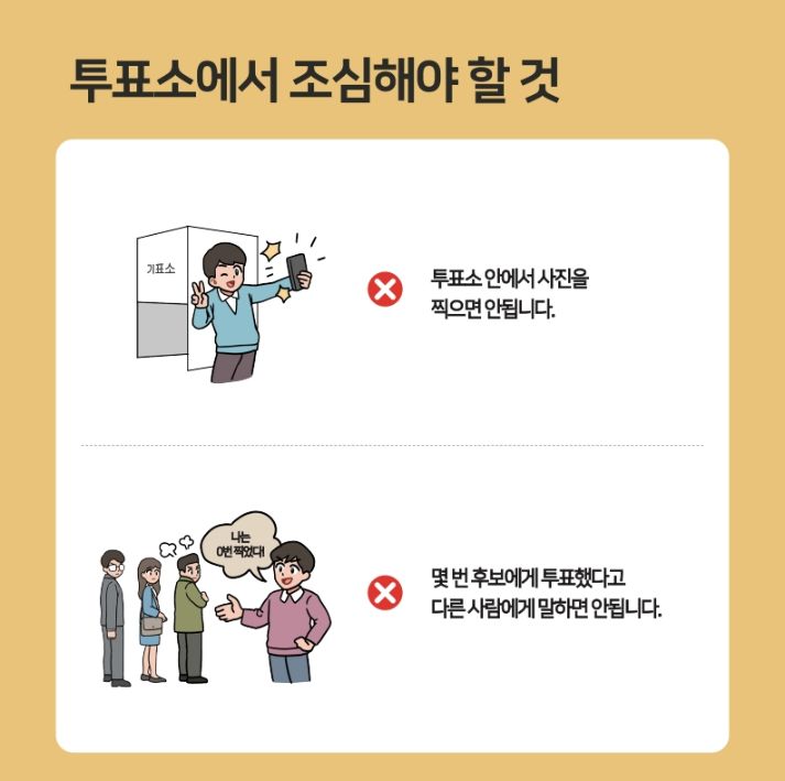 - 투표소 위치 확인: 중앙선거관리위원회 홈페이지, 모바일 앱, 또는 우편으로 받은 선거 안내문을 통해 내 투표소 위치를 꼭 확인해 주세요.