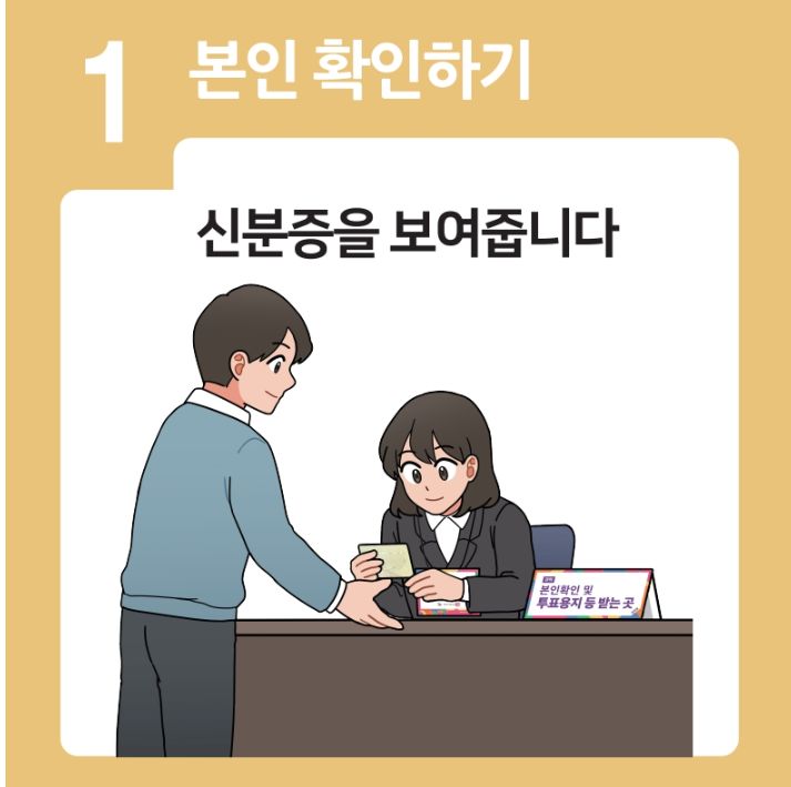 신분증(실물 또는 인증된 모바일 신분증)을 지참해 본인 확인을 받고, 투표용지를 받아 기표소에서 투표를 완료하면 됩니다.