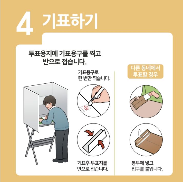 - 기표 시 유의사항: 두 곳 이상 표시하거나 용지를 훼손하면 무효 처리되며, 재투표는 불가합니다.