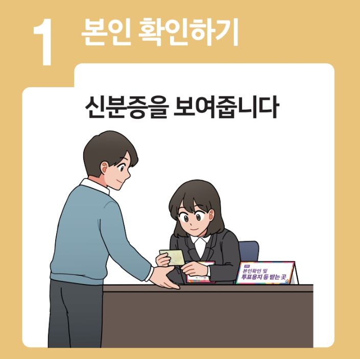 본투표 당일 투표소에서는 본인 확인 후 선거인명부에 서명하고, 투표용지를 받아 기표소에서 투표를 진행합니다.