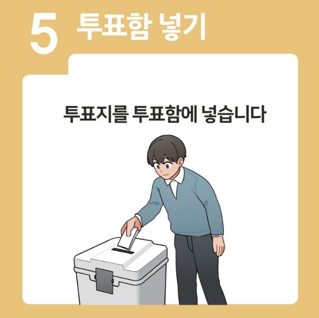 | 7 | 투표지 반으로 접어 투표함에 넣기 (관내), 회송용 봉투 밀봉 후 투표함 (관외) |